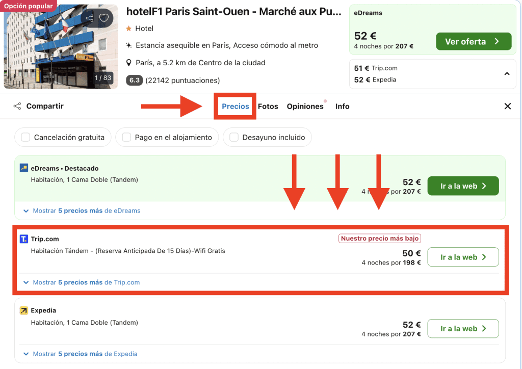 En Trivago, dirígete a la pestaña «Precios» en la página del hotel y elige la opción destacada: