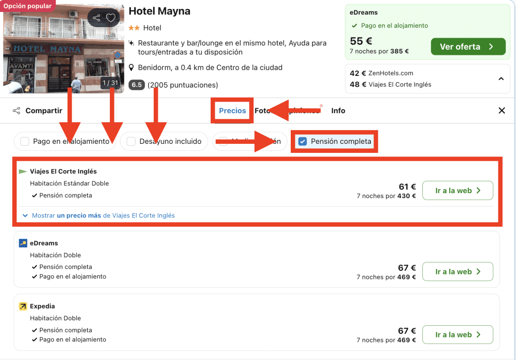 En Trivago, dirígete a la pestaña «Precios» en la página del hotel y elige la opción destacada: