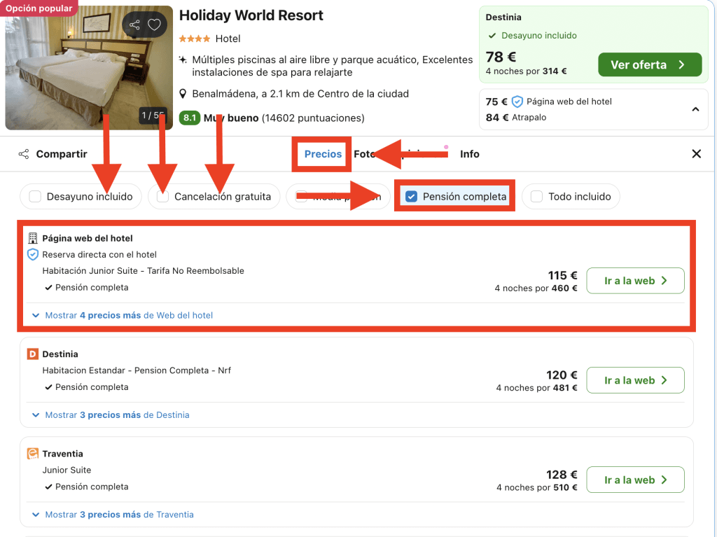 En Trivago, dirígete a la pestaña «Precios» en la página del hotel y elige la opción destacada: