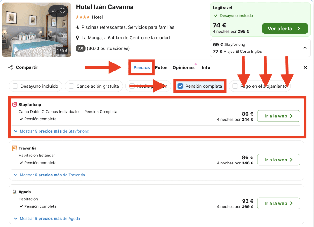 En Trivago, dirígete a la pestaña «Precios» en la página del hotel y elige la opción destacada: