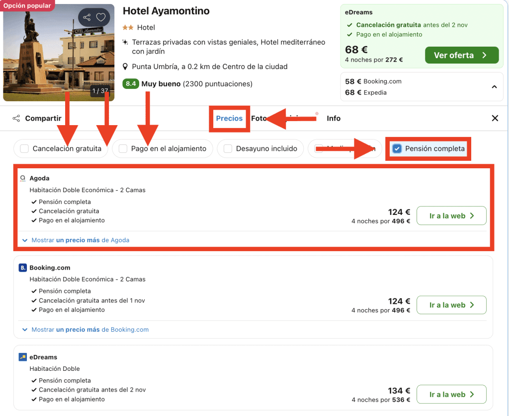 En Trivago, dirígete a la pestaña «Precios» en la página del hotel y elige la opción destacada: