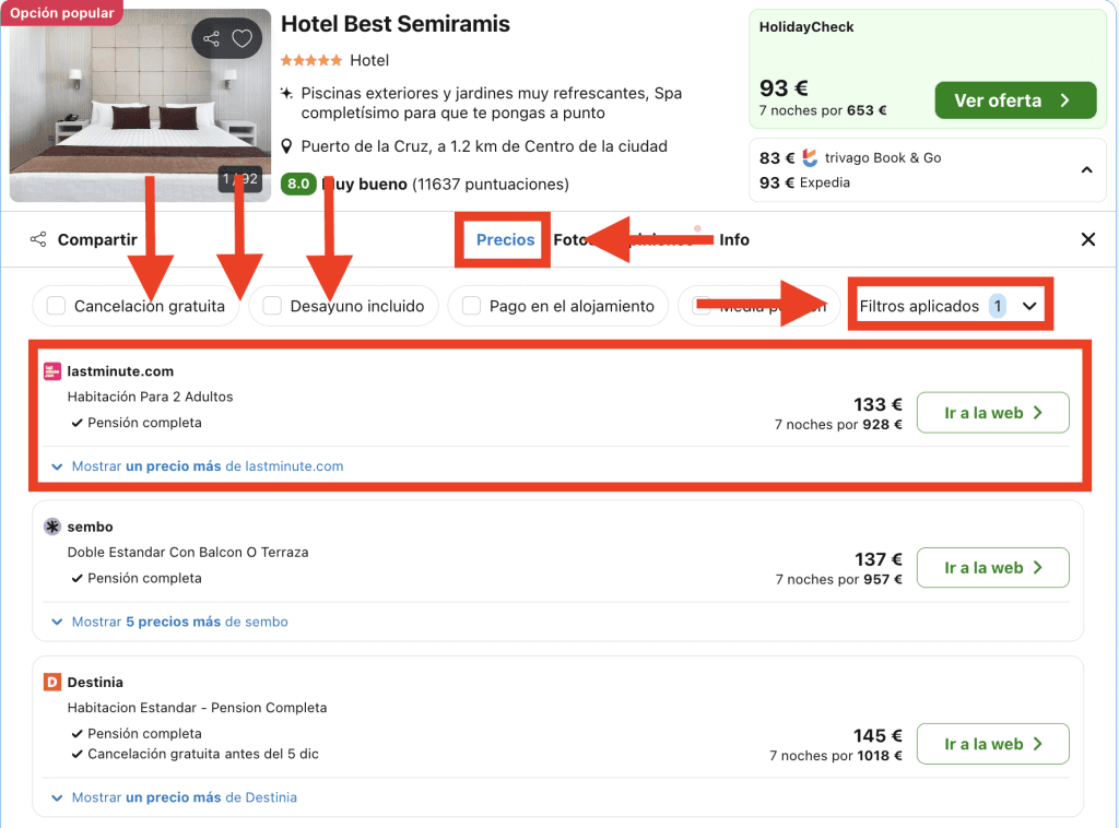 En Trivago, dirígete a la pestaña «Precios» en la página del hotel y elige la opción destacada: