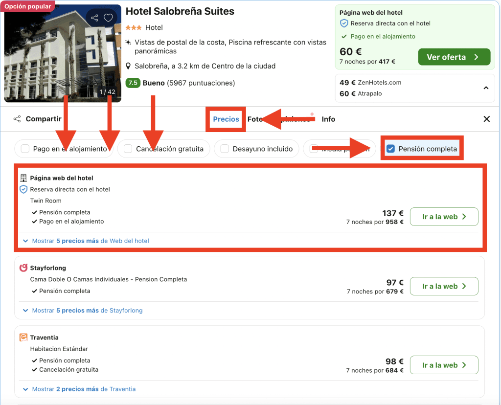 En Trivago, dirígete a la pestaña «Precios» en la página del hotel y elige la opción destacada: