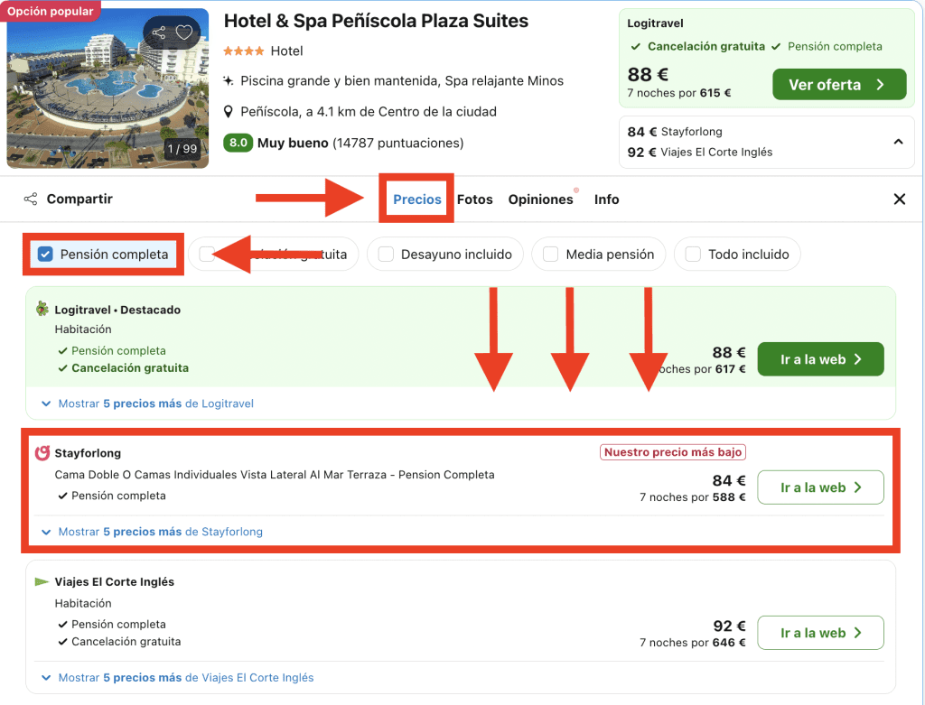 En Trivago, dirígete a la pestaña «Precios» en la página del hotel y elige la opción destacada: