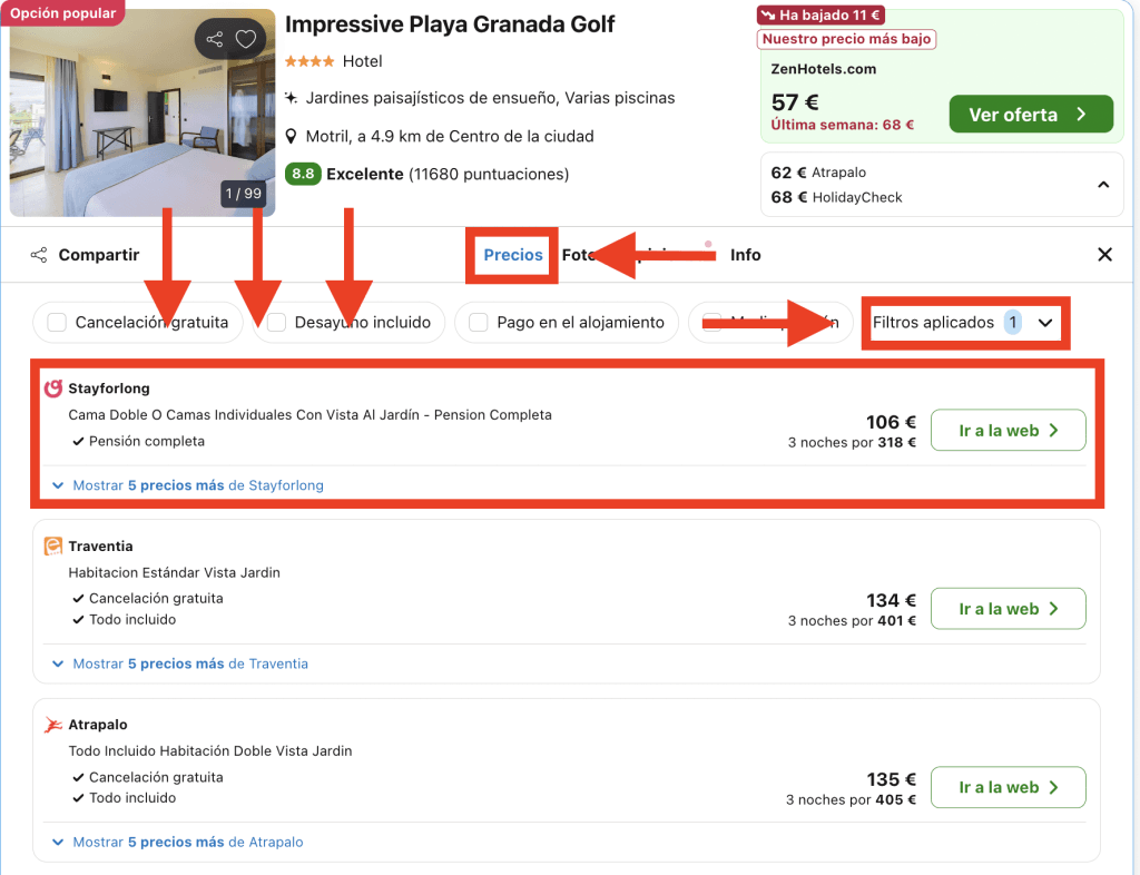 En Trivago, dirígete a la pestaña «Precios» en la página del hotel y elige la opción destacada: