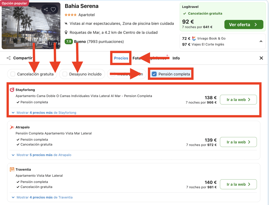 En Trivago, dirígete a la pestaña «Precios» en la página del hotel y elige la opción destacada: