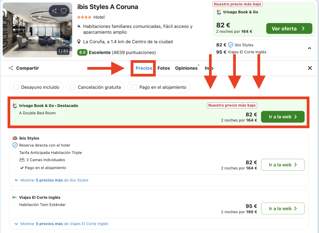 En Trivago, dirígete a la pestaña «Precios» en la página del hotel y elige la opción destacada: