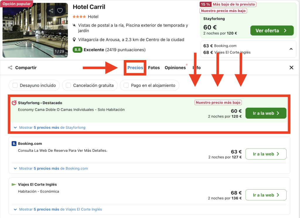 En Trivago, dirígete a la pestaña «Precios» en la página del hotel y elige la opción destacada: