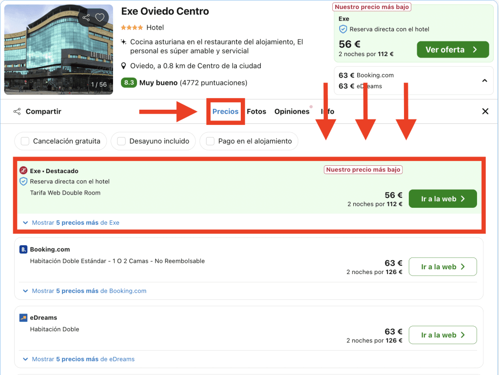 En Trivago, dirígete a la pestaña «Precios» en la página del hotel y elige la opción destacada: