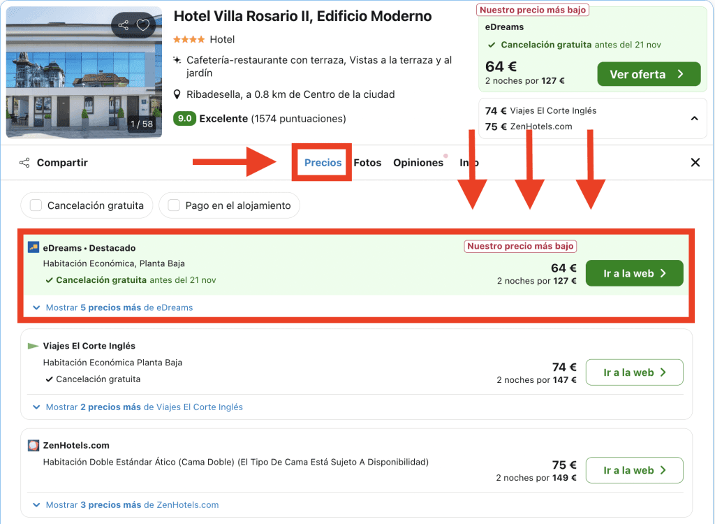 En Trivago, dirígete a la pestaña «Precios» en la página del hotel y elige la opción destacada: