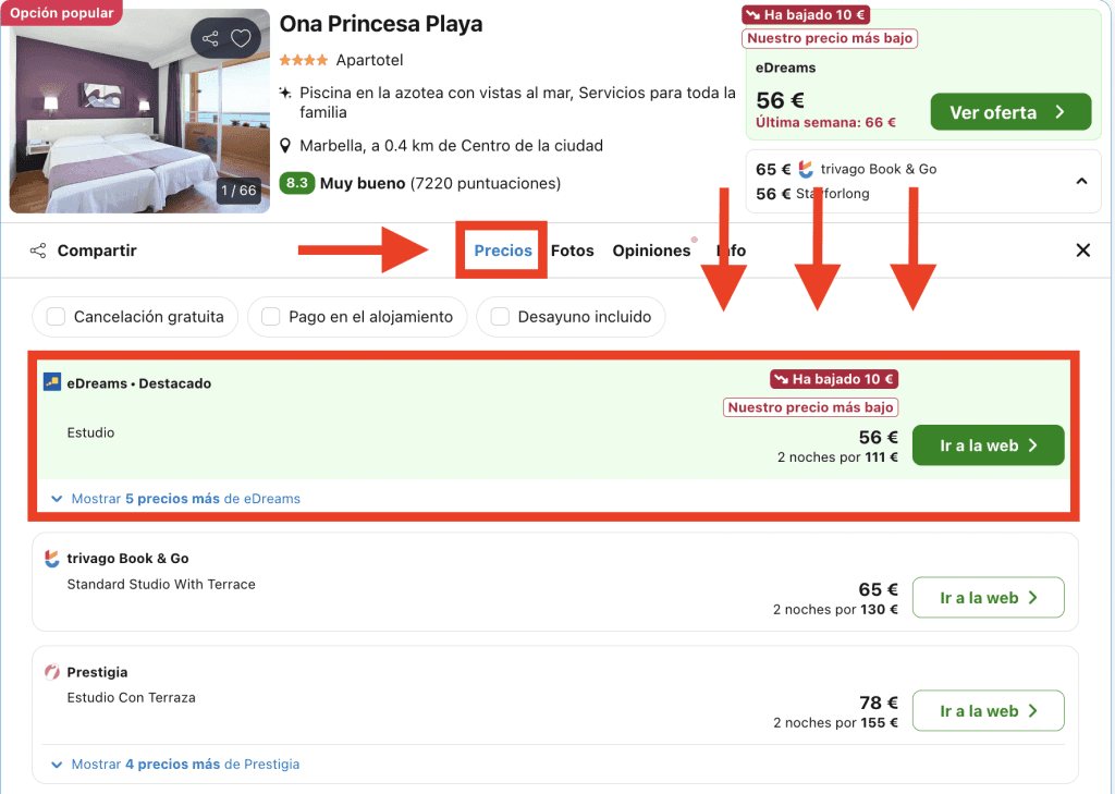 En Trivago, dirígete a la pestaña «Precios» en la página del hotel y elige la opción destacada:
