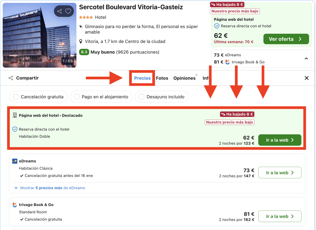 En Trivago, dirígete a la pestaña «Precios» en la página del hotel y elige la opción destacada: