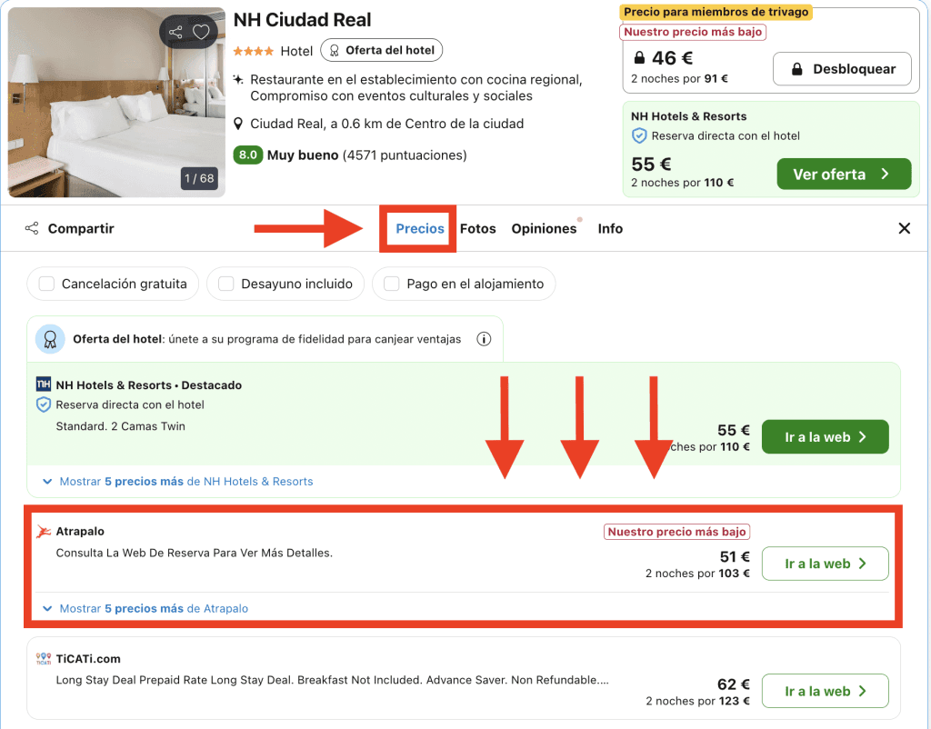 En Trivago, dirígete a la pestaña «Precios» en la página del hotel y elige la opción destacada: