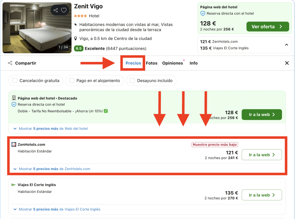 En Trivago, dirígete a la pestaña «Precios» en la página del hotel y elige la opción destacada: