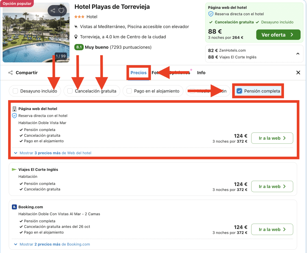 En Trivago, dirígete a la pestaña «Precios» en la página del hotel y elige la opción destacada: