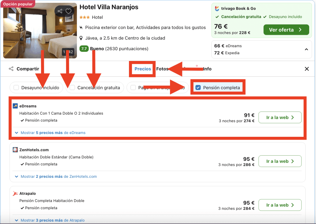 En Trivago, dirígete a la pestaña «Precios» en la página del hotel y elige la opción destacada: