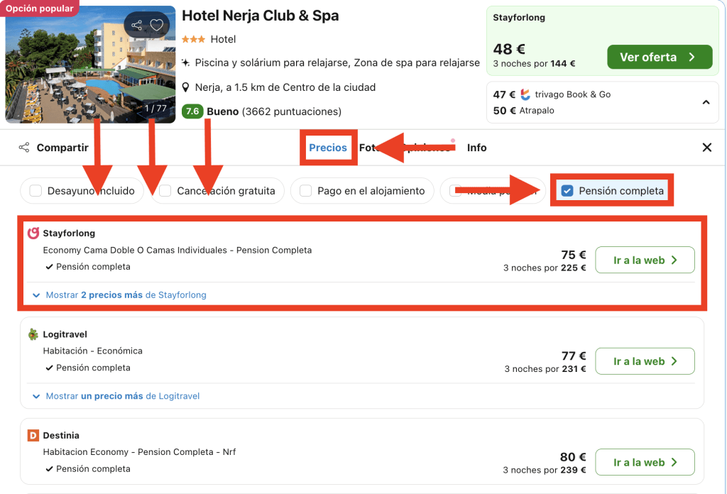 En Trivago, dirígete a la pestaña «Precios» en la página del hotel y elige la opción destacada: