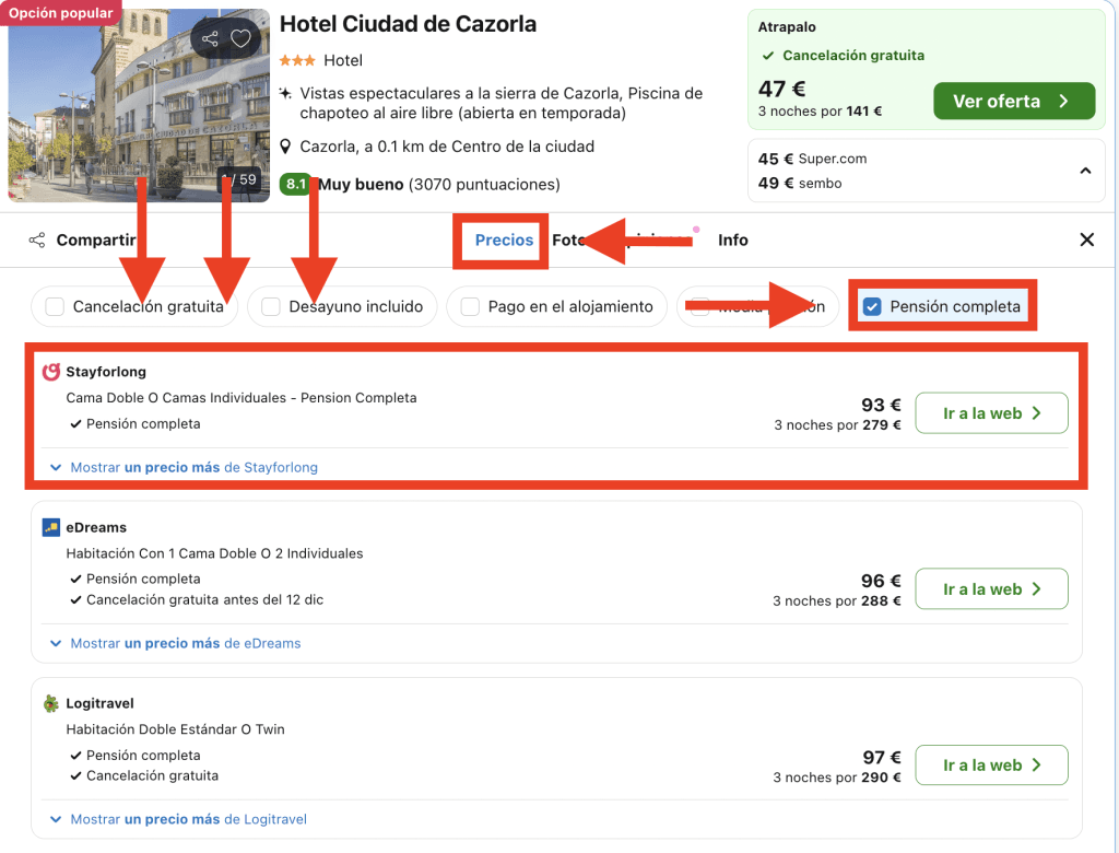 En Trivago, dirígete a la pestaña «Precios» en la página del hotel y elige la opción destacada:
