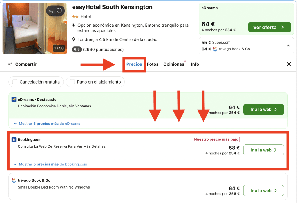 En Trivago, dirígete a la pestaña «Precios» en la página del hotel y elige la opción destacada: