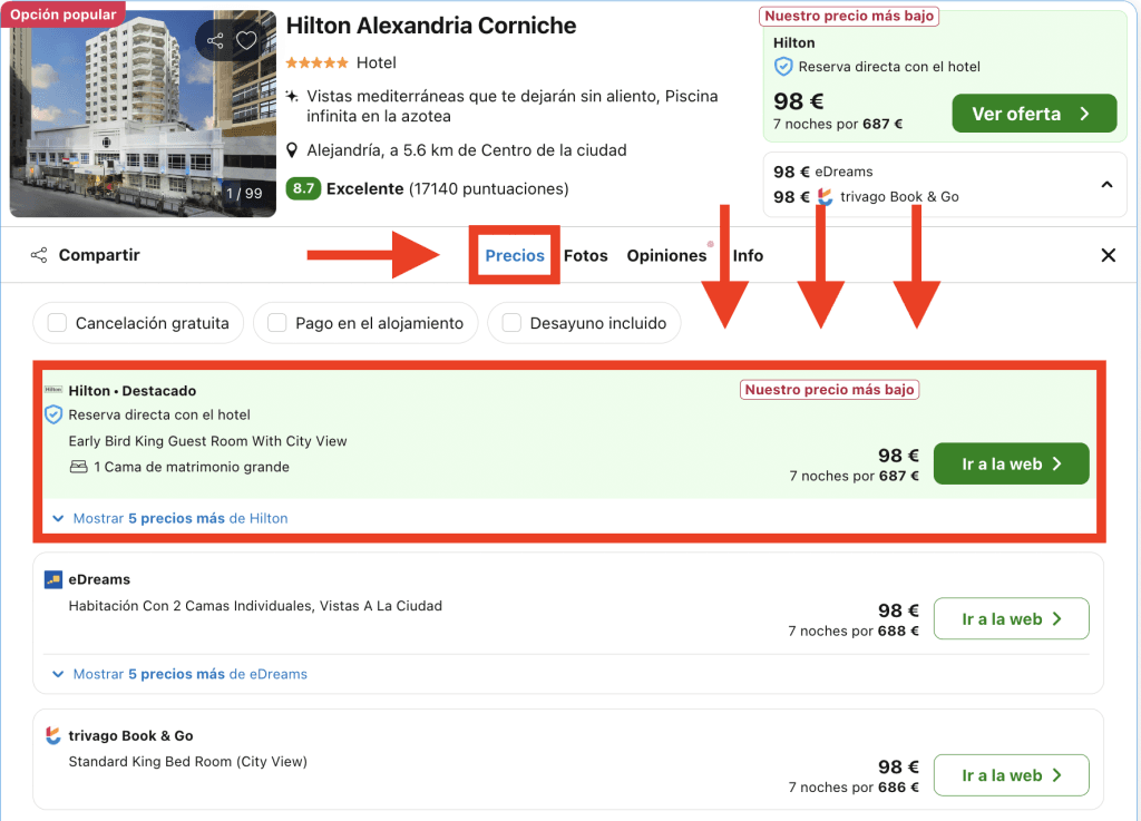 En Trivago, dirígete a la pestaña «Precios» en la página del hotel y elige la opción destacada: