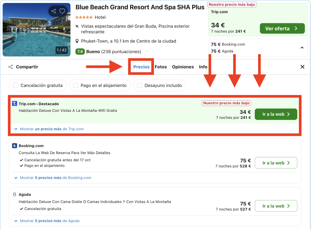 En Trivago, dirígete a la pestaña «Precios» en la página del hotel y elige la opción destacada: