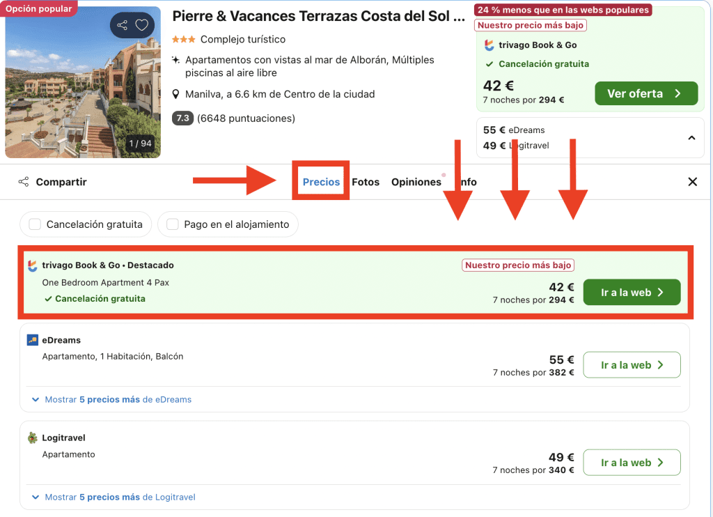 En Trivago, dirígete a la pestaña «Precios» en la página del hotel y elige la opción destacada: