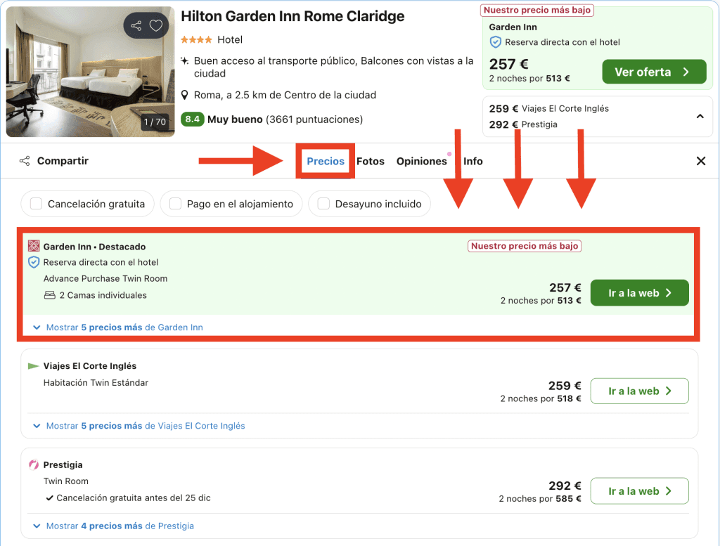 En Trivago, dirígete a la pestaña «Precios» en la página del hotel y elige la opción destacada: