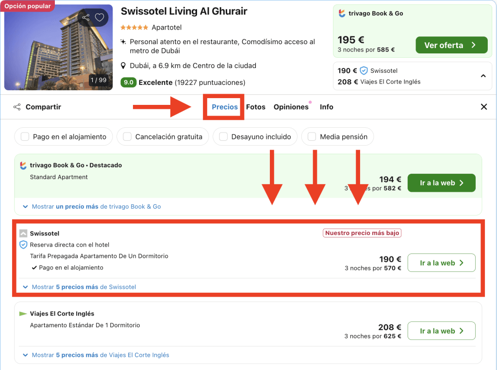 En Trivago, dirígete a la pestaña «Precios» en la página del hotel y elige la opción destacada: