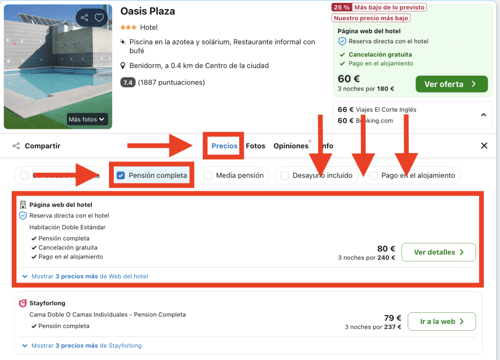 En Trivago, dirígete a la pestaña «Precios» en la página del hotel y elige la opción destacada: