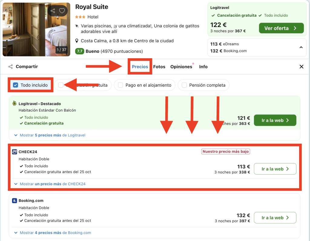 En Trivago, dirígete a la pestaña «Precios» en la página del hotel y elige la opción destacada: