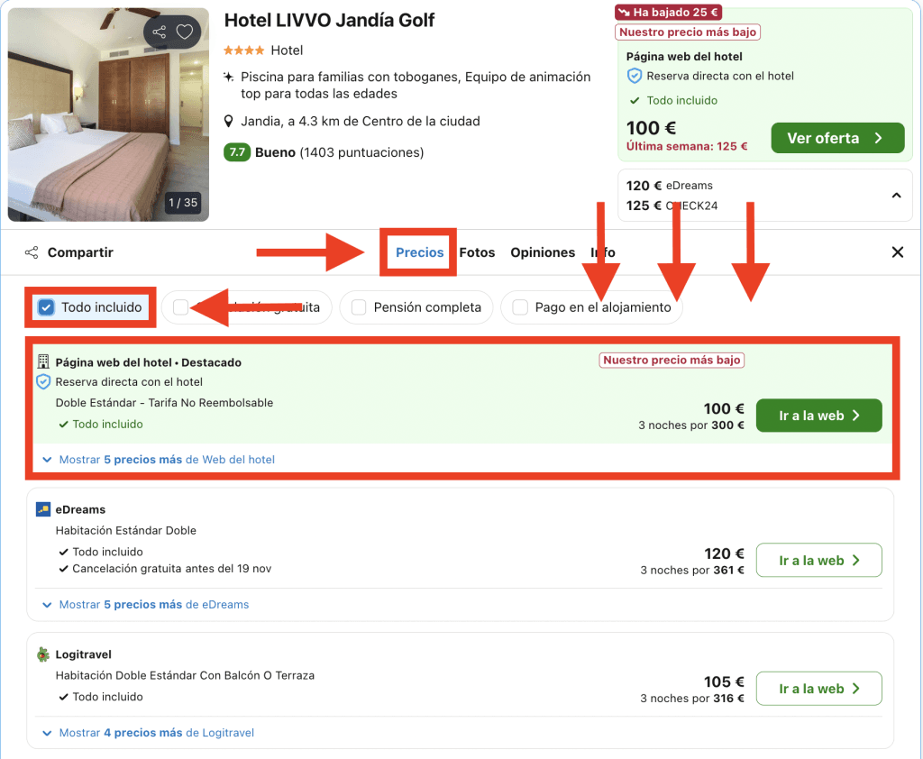 En Trivago, dirígete a la pestaña «Precios» en la página del hotel y elige la opción destacada: