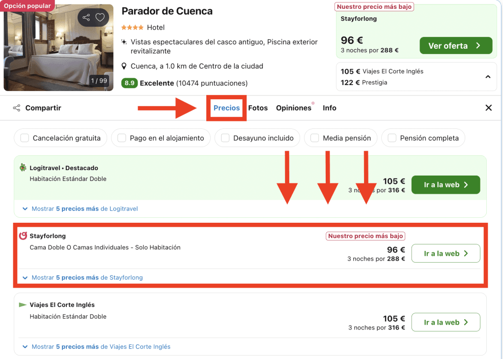En Trivago, dirígete a la pestaña «Precios» en la página del hotel y elige la opción destacada: