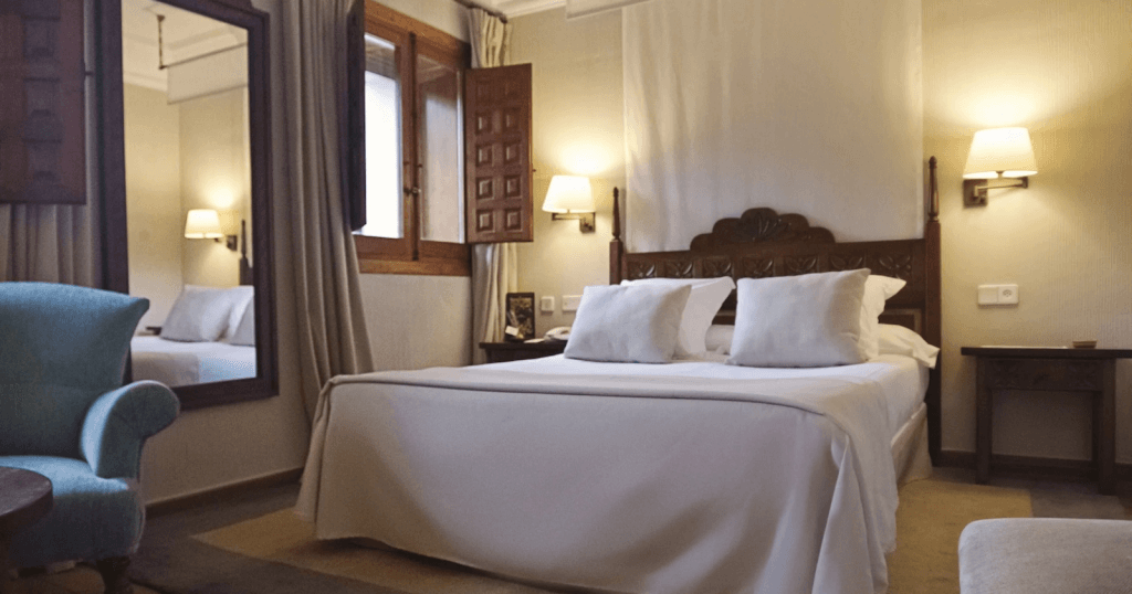 El hotel se erige sobre el antiguo Convento de San Pablo, edificio tardogótico plateresco de 1523 asociado al cercano Puente de San Pablo. Conserva muros de piedra, artesonados y rincones antiguos, pero te ha dejado para que duermas como en casa y tengas espacios amplios y tranquilos. Las habitaciones son claras, las camas cómodas, buenos cierres y el silencio reparador después de un día de cuestas y atalayas.