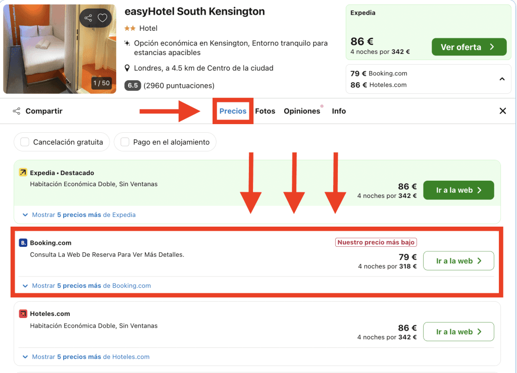 En Trivago, dirígete a la pestaña «Precios» en la página del hotel y elige la opción destacada: