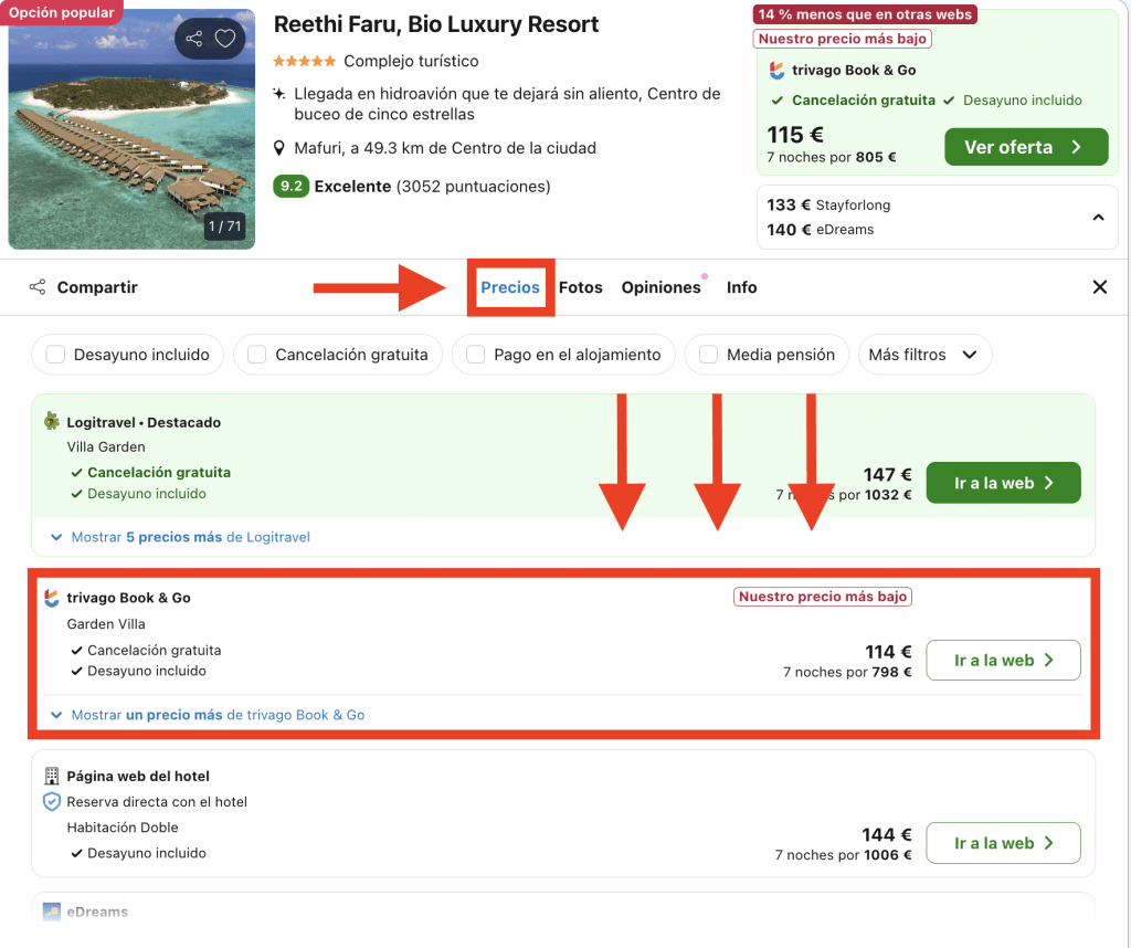 En Trivago, dirígete a la pestaña «Precios» en la página del hotel y elige la opción destacada: