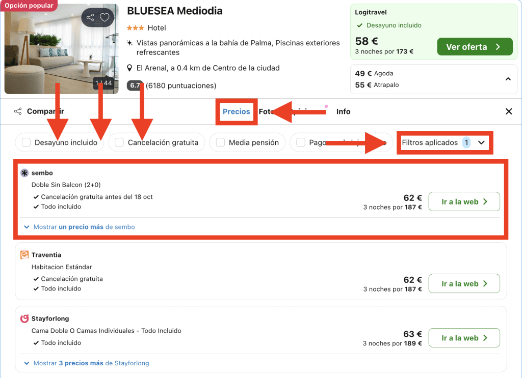 En Trivago, dirígete a la pestaña «Precios» en la página del hotel y elige la opción destacada: