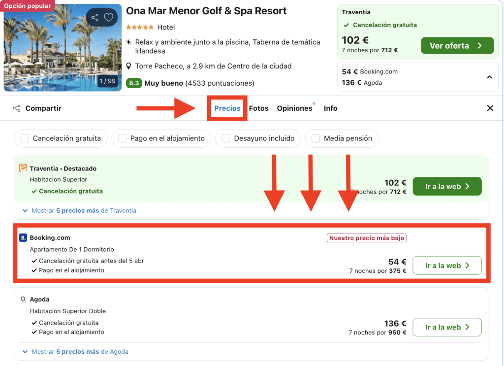 En Trivago, dirígete a la pestaña «Precios» en la página del hotel y elige la opción destacada: