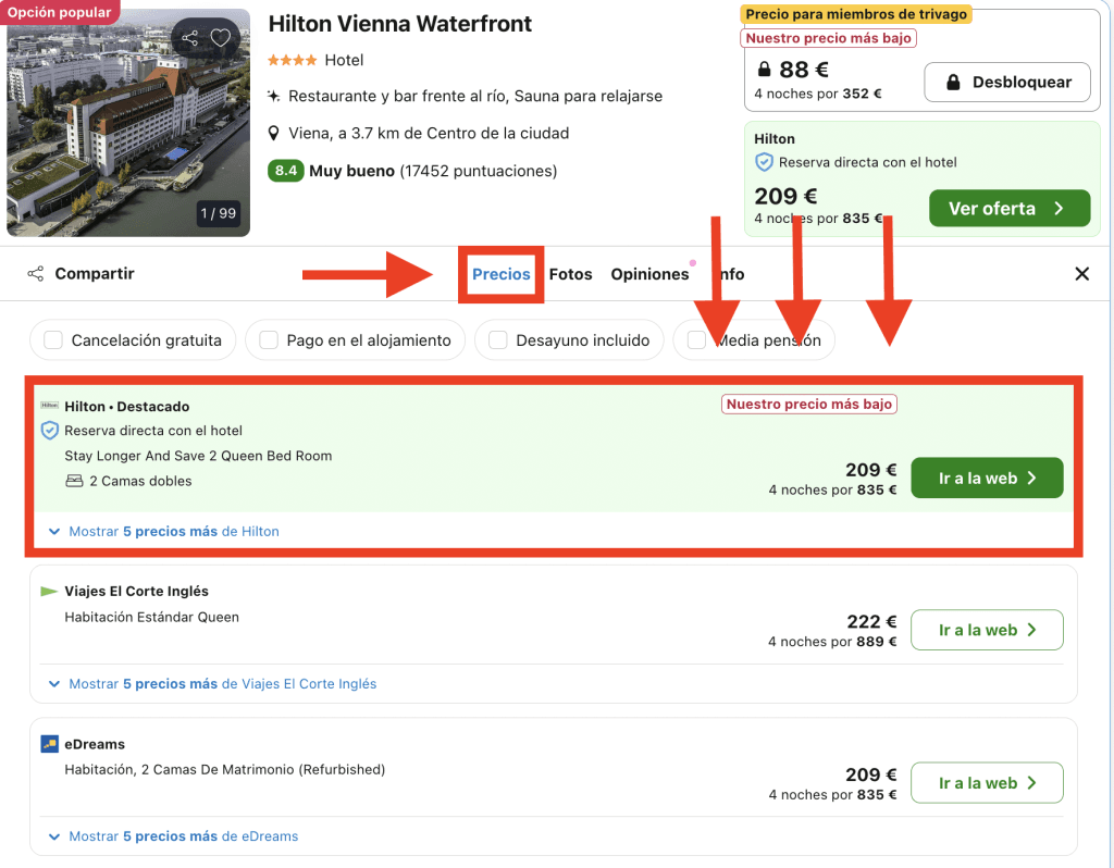 En Trivago, dirígete a la pestaña «Precios» en la página del hotel y elige la opción destacada: