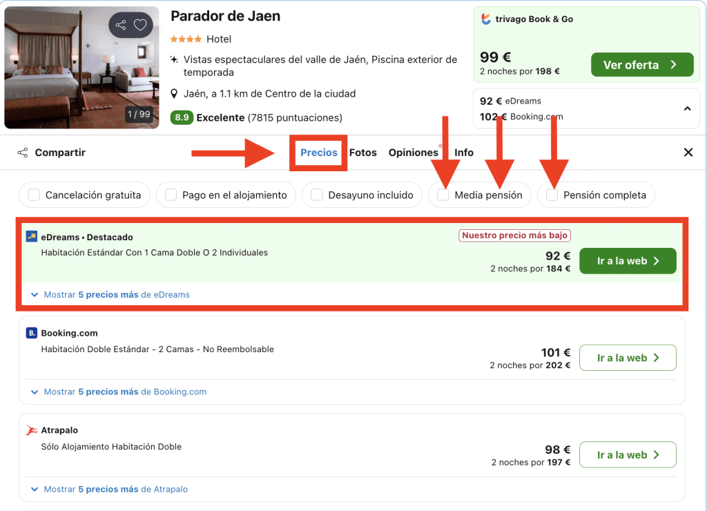 En Trivago, dirígete a la pestaña «Precios» en la página del hotel y elige la opción destacada: