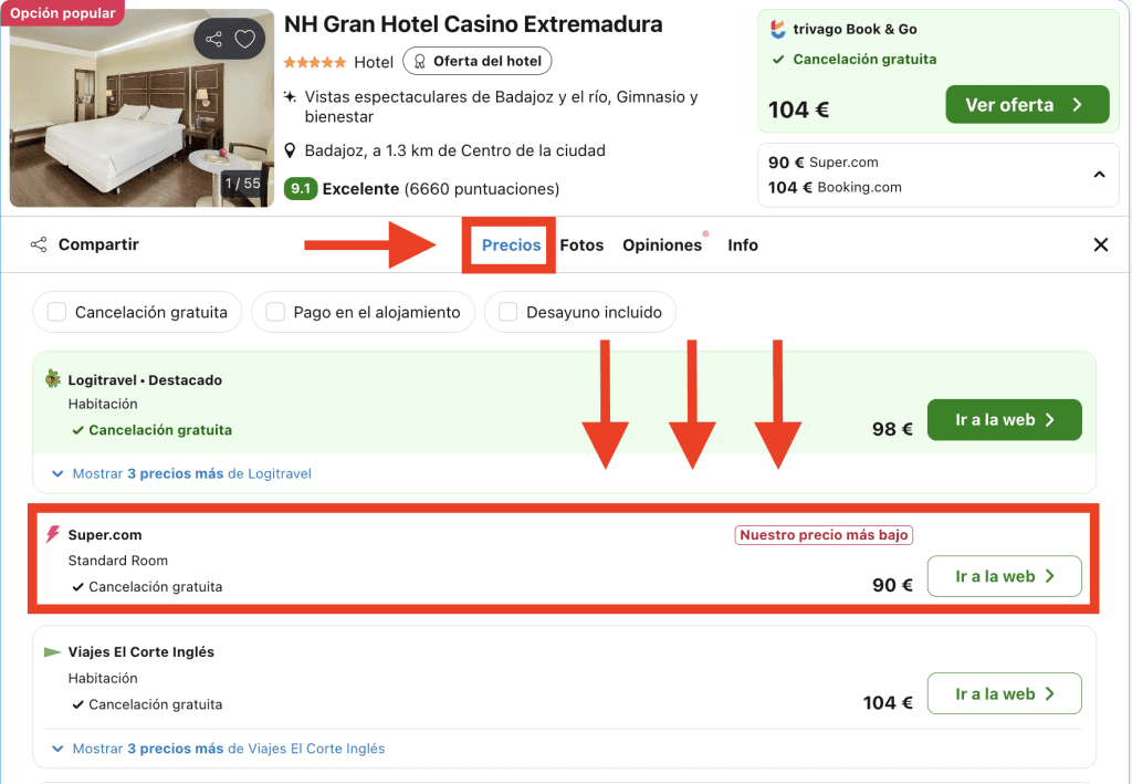 En Trivago, dirígete a la pestaña «Precios» en la página del hotel y elige la opción destacada: