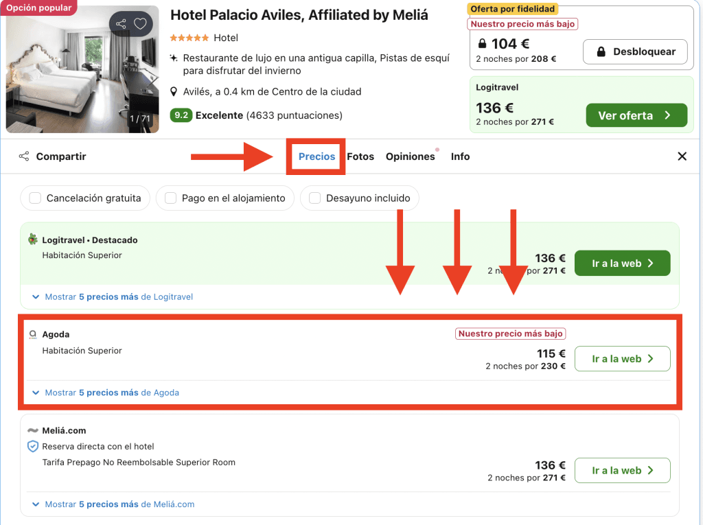 En Trivago, dirígete a la pestaña «Precios» en la página del hotel y elige la opción destacada: