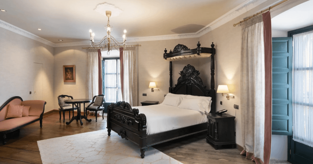 En un antiguo palacio restaurado, este hotel destaca por la luz, los techos altos y los detalles de época. La capilla del siglo XVII convertida en restaurante es su rincón más fotografiado: piedra, artesonado y un aura que transforma una cena en algo memorable. Si te gusta recibir el Año Nuevo en un lugar con historia y buena mesa, aquí te va a encantar.