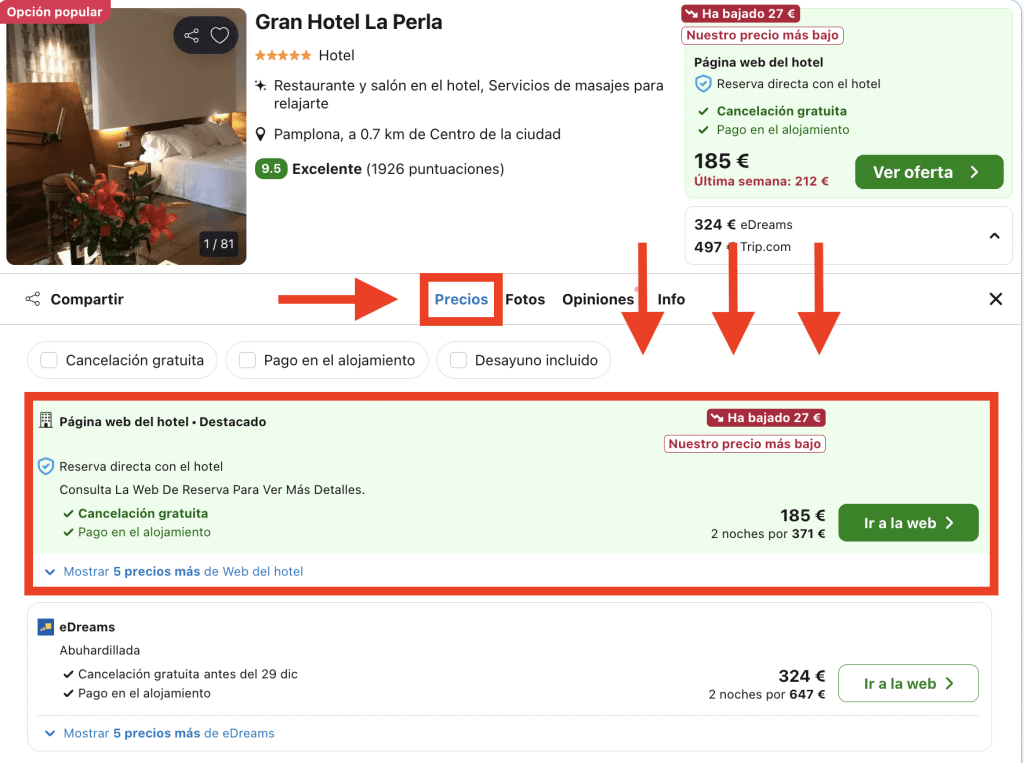 En Trivago, dirígete a la pestaña «Precios» en la página del hotel y elige la opción destacada: