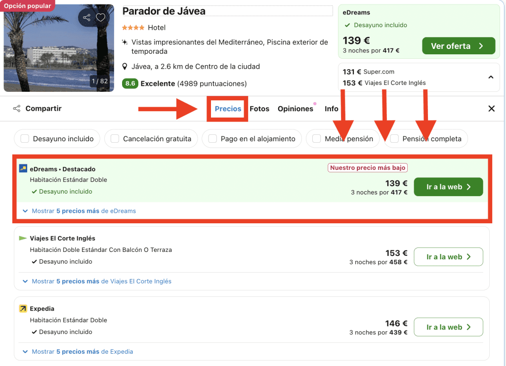 En Trivago, dirígete a la pestaña «Precios» en la página del hotel y elige la opción destacada: