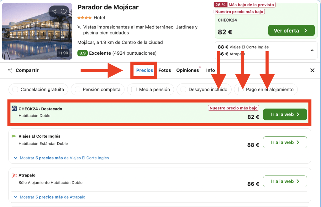 En Trivago, dirígete a la pestaña «Precios» en la página del hotel y elige la opción destacada: