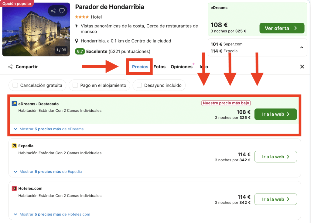 En Trivago, dirígete a la pestaña «Precios» en la página del hotel y elige la opción destacada: