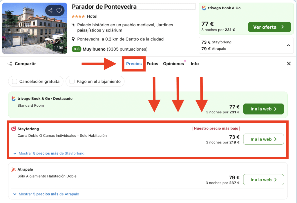 En Trivago, dirígete a la pestaña «Precios» en la página del hotel y elige la opción destacada:
