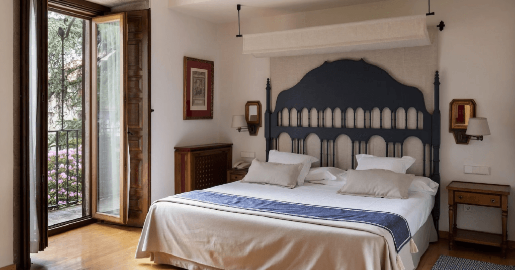 El Parador de Pontevedra se ubica en un pazo del siglo XVI, antigua residencia nobiliaria, y ya desde que entras por la puerta hay algo mágico: la piedra, los suelos, los techos altos, los muebles antiguos… todo te recuerda que estás en un lugar con historia, con sabor, con mimo. Las habitaciones están amuebladas sin pretensiones modernas que alteren el carácter del edificio, pero con lo esencial para un buen descanso: cómodas camas, calefacción, vistas al jardín o a los tejados del casco histórico y silencio por la noche.