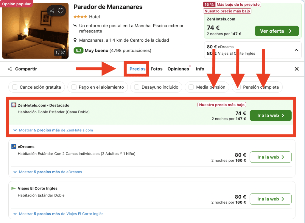 En Trivago, dirígete a la pestaña «Precios» en la página del hotel y elige la opción destacada: