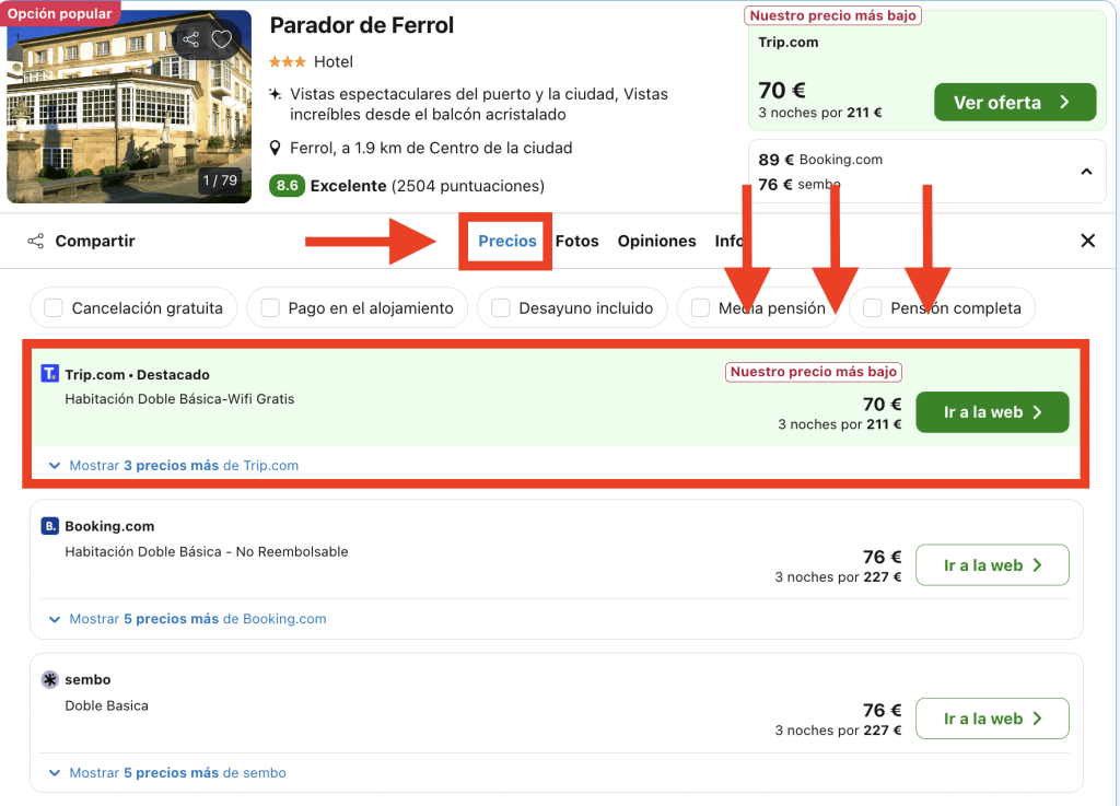 En Trivago, dirígete a la pestaña «Precios» en la página del hotel y elige la opción destacada: